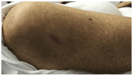 Mohs surgery of the lower tibia resulted in a 3 34-cm defect (Fig 1, A). A graft was determined to be the best closure option. The upper lateral arm was chosen as the donor site; this location provides an accessible area for the patient to care for and, when healed, often resembles the scar that commonly results from smallpox vaccinations (Fig 2).