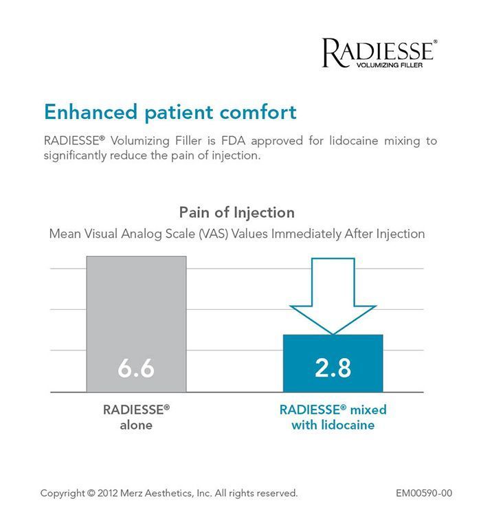 • RADIESSE® Volumizing Filler is FDA approved to mix with lidocaine to significantly improve comfort during procedure.