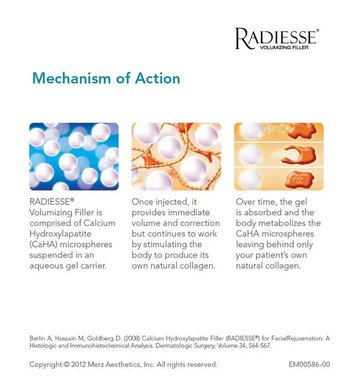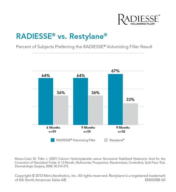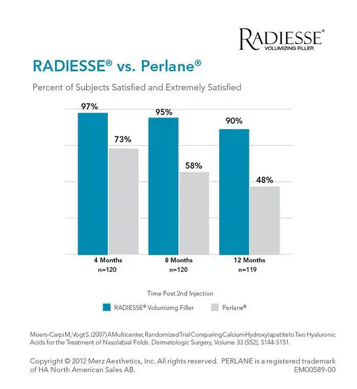 1 Berlin A, Hussain M, Goldberg D. (2008) Calcium Hydroxylapatite Filler (RADIESSE®) for Facial Rejuvenation: A Histologic and Immonohistochemical Analysis. Dermatologic Surgery, Volume 34, S64-S67.  2 Moers-Carpi M, Vogt S, et. Al (2007) A Multicenter, Randomized Trial Comparing Calcium Hydroxylapatite to Two Hyaluronic Acids for Treatment of Nasolabial Folds, Dermatologic Surgery, 33 (2S), 144s-151s.  3 Bass LS, Smith S, Busso M, McClaren M. (2010) Calcium Hydroxylapatite (RADIESSE) for Treatment of Nasolabial Folds: Long-Term Safety and Efficacy Results.   4 Moers-Carpi M, Tufet J. (2007) Calcium Hydroxylapatite versus Nonanimal Stabilized Hyaluronic Acid for the Correction of Nasolabial Folds: A 12-Month, Multicenter, Prospective, Randomized, Controlled, Split-Face Trial, Dermatologic Surgery, 2008; 34:210-215.